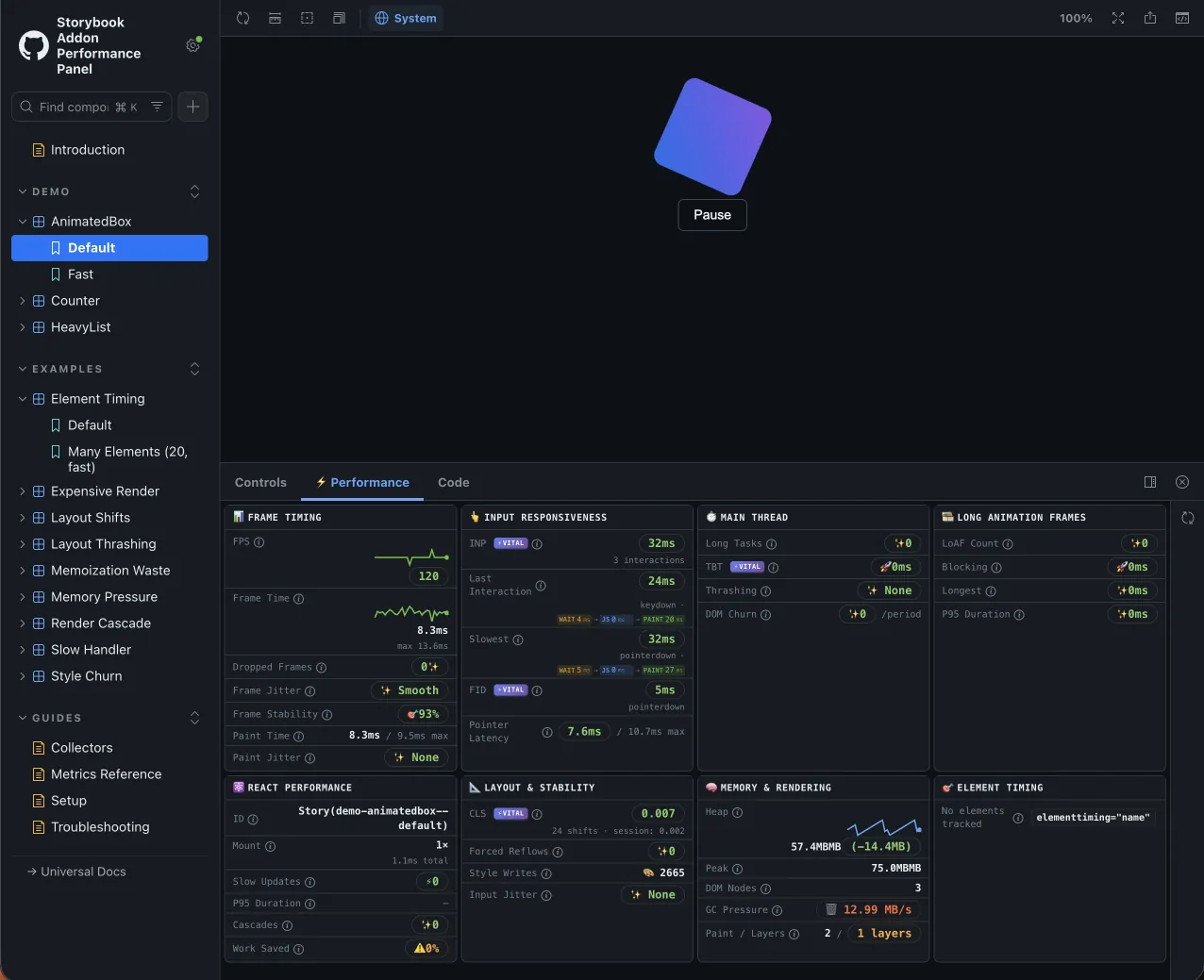 A Storybook addon for real-time performance monitoring. It surfaces frame timing, input responsiveness, layout stability, React profiling, memory pressure, and more — directly inside Storybook.